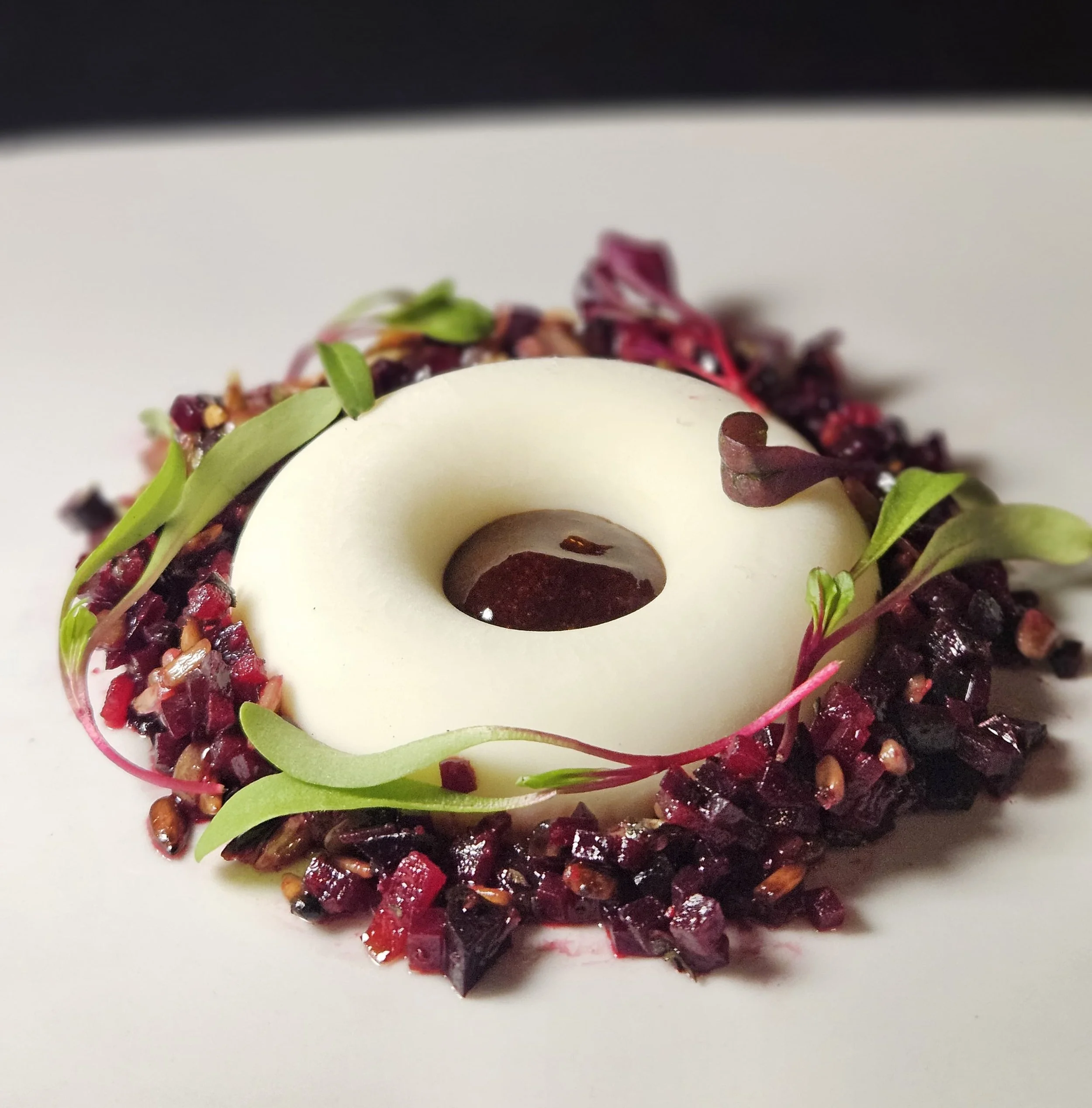 juniper brown butter, celeriac puree, puffed wild rice, beet syrup, wild mushroom, rosemary bottarga